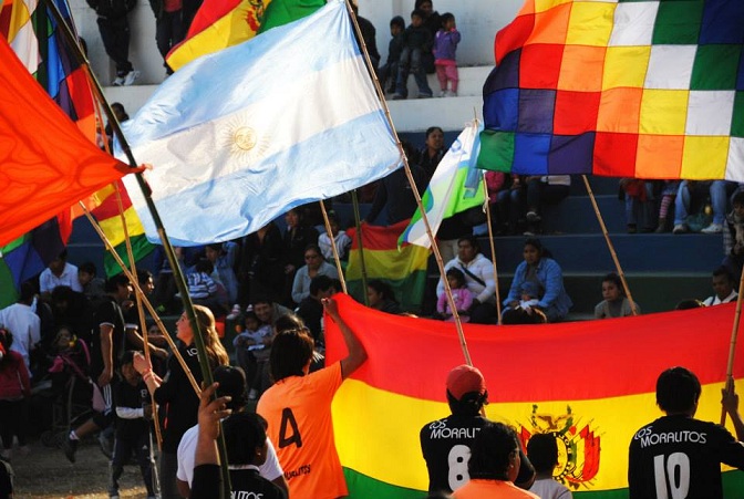 “Ya no bajan de los barcos. Ahora llegan en colectivos. La mayoría proviene del altiplano. Las causas principales que influyen en la decisión migratoria se relacionan con aspectos económicos, laborales y familiares”. (El Imperio de los colores – Hugo Curletto / Marcos Altamirano) “El imperio de los colores” es un documental realizado por Hugo Curletto y Marcos Altamirano que resalta los aspectos positivos del fenómeno de la migración como una estrategia de vida, como un derecho esencial e inalienable que contribuye a la inclusión social y el respeto por la diversidad cultural. La producción audiovisual recorre pequeñas historias de inmigrantes bolivianos en Río Cuarto e instala la idea de que toda migración arrastra a la construcción de una nueva realidad. Por eso, para mostrar la conmemoración del 188º aniversario de la Independencia del Estado Plurinacional de Bolivia que realizó la Comunidad Boliviana radicada en Río Cuarto, elegimos el nombre del documental realizado por Curletto y Altamirano (acá pueden ver el tráiler: http://www.youtube.com/watch?v=cSzW1ad4Gdw). Entre tantas costumbres, el fútbol aparece como una de las principales para los bolivianos que residen en Río Cuarto. Esta actividad deportiva no sólo les permite encontrar un momento de esparcimiento y desarrollar la práctica deportiva que los apasiona. Es a través de este deporte donde pueden revalorizar las tradiciones del altiplano y darlas a conocer al resto de la sociedad. El fútbol les posibilita desarrollarse, social y culturalmente, en una tierra que muchas veces consideran ajena. Pero el domingo 4 de agosto, cientos de bolivianos se llegaron hasta el corazón de la ciudad para festejar en el Anfiteatro del Parque Sarmiento un aniversario más del país del altiplano. Redacción Al Toque Fotos: Marcos Altamirano