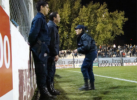 En este contexto, sólo seis efectivos policiales estuvieron en el estadio donde en principio no pudieron evitar un hecho violento. En pleno juego de tercera división, hinchas locales lanzaron piedras desde las afueras del estadio hacia los simpatizantes visitantes ubicados en su tribuna. Luego -con el juego de primera división- todo fue fiesta. Al final de la noche, se observaron varios móviles en las adyacencias del estadio “albo”.